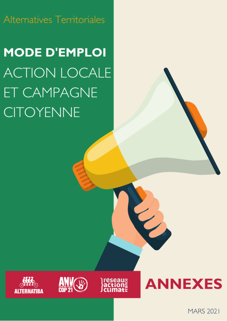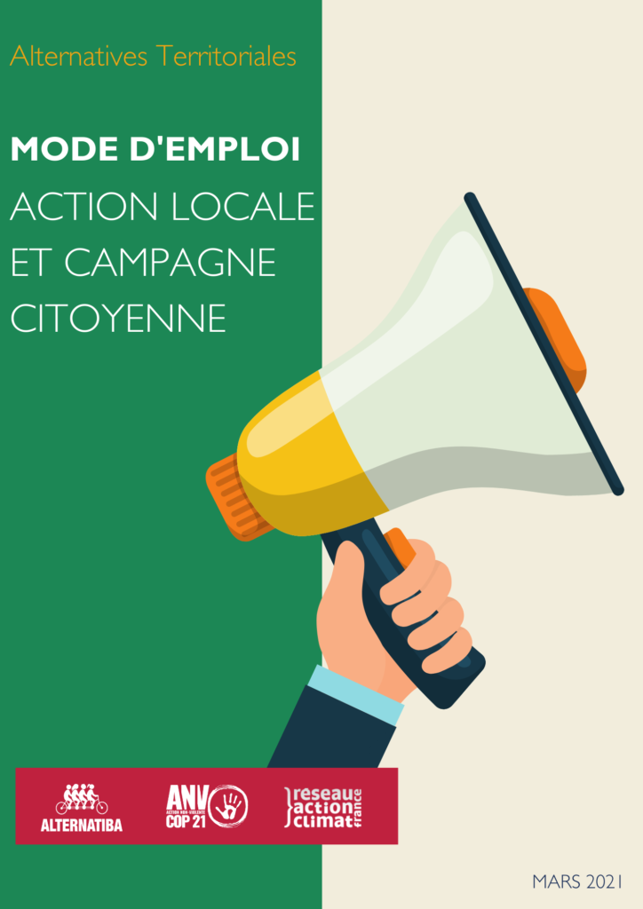 La campagne Alternatives territoriales, portée par Alternatiba, ANV-COP21 et le Réseau Action Climat, publie son “Mode d’emploi : Action locale et campagne citoyenne” ! Cet outil a pour ambition de renforcer les dynamiques des collectifs dans leur plaidoyer auprès des élu·es locaux et locales. Le but ? Apprendre à définir une stratégie pour avoir des victoires, être force de proposition et d’opposition auprès des élu·es, bref mener une campagne locale  ! Ce Mode d’emploi à destination de tous les collectifs porteurs d’une mobilisation locale vous propose des outils concrets pour penser et mettre en oeuvre une bonne campagne !