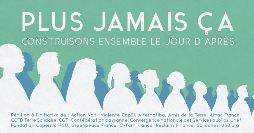 Plus jamais ça ! Lorsque la fin de la pandémie le permettra, nous nous donnons rendez-vous pour réinvestir les lieux publics et construire notre « jour d’après ». Nous en appelons à toutes les forces progressistes et humanistes, et plus largement à toute la société, pour reconstruire ensemble un futur, écologique, féministe et social, en rupture avec les politiques menées jusque-là et le désordre néolibéral.
