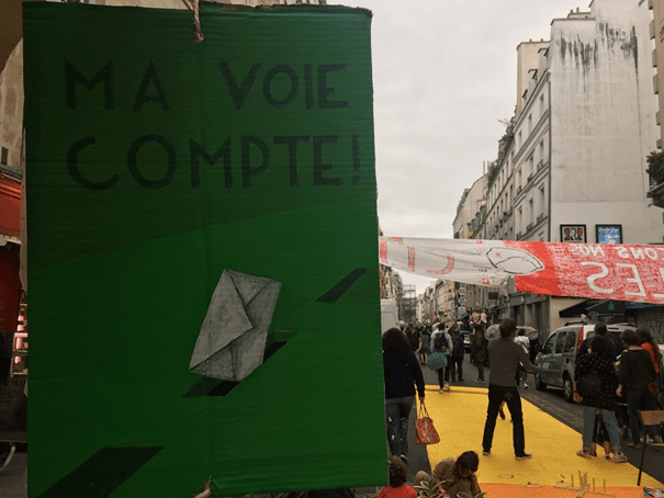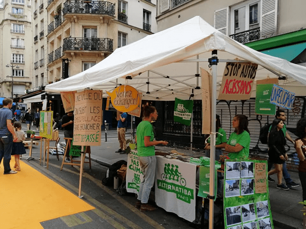 Le groupe local Alternatiba Paris s’est emparé de la thématique : pour ce faire, il s’est rapproché d’autres organisations qui partagent la même vision, entre autres Unicef, le Réseau Action Climat, Paris Sans Voiture, Respire, France Nature Environnement… Pour sensibiliser à cette problématique et pousser les élu·e·s à prendre des mesures, le groupe local Alternatiba Paris va lancer en Octobre #LaRueEstÀNous : une campagne en vue des municipales concentrée sur les thèmes de mobilité, de pollution de l’air et de réappropriation de l’espace public. L’objectif est de transformer Paris en permettant à chacun·e de respirer un air sain et d’avoir son mot à dire sur l’organisation de l’espace public. Iels demandent que les véhicules motorisés soient l’exception plutôt que la norme : réduire la place de la voiture, permettre le développement d’alternatives pour une mobilité douce accessible à toutes et tous, voilà les deux mots d’ordre de cette campagne. Le Dimanche 22 Septembre, iels ont donc installé un stand sur le « quartier libre du Faubourg Saint Denis. » Étienne, du groupe local Paris, précise : “Nous ne sommes pas dans l’opposition à la voiture et ne voulons pas être dans la culpabilisation des automobilistes. Nous sommes plutôt dans l’optique de proposer d’améliorer l’utilisation des modes de transport alternatifs, tels que les transports en commun et le vélo pour en alléger les flux.” La démarche de leur campagne s’inscrit dans une réflexion plus globale sur la mobilité, qui doit se faire aux prochaines élections municipales.