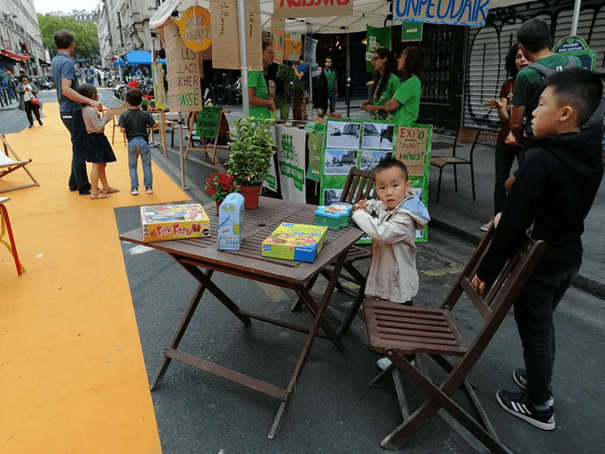 Le groupe Alternatiba Paris a participé à montrer que l’espace de la voiture peut être utilisé à d’autres fins. Ils ont organisé des ateliers de végétalisation et de construction de bacs, une petite série de jeux pour enfants et surtout un moment de convivialité et de partage. Une fête urbaine s’est ainsi déroulée dans la rue. Pour Valentin, co-organisateur de l’action : « Ce qui m’a énormément plu dans l’organisation de l’action c’est de faire le lien avec les autres assos et avec les riverains en leur proposant, comme Quartier Libre avait pensé, un terrain de jeu et d’expression, de revendication. Une certaine tribune des alternatives festive et engagée. Certains acteurs critiquaient d’ailleurs l’organisation de l’espace urbain sans avoir de sensibilité écologique. Mais nous partagions toutes et tous cette envie d’occuper autrement les rues, ce constat que l’espace urbain est un vrai problème. »